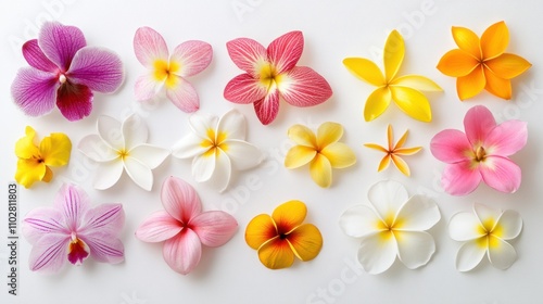 Bright tropical flower assortment with vibrant plumeria and orchids scattered elegantly on white