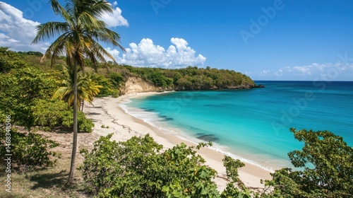 Bright tropical summer beach with turquoise sea, white sand, and lush palm trees swaying under a vibrant blue sky
