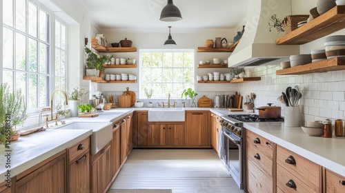 kitchen, interior, design, wood, cabinet, shelf, sink, countertop, window, decor, lighting, plant, appliance, utensil, dish, tile, farmhouse, rustic, modern, home, cooking, style, arrangement, ceramic, pottery, bowl, cup, plate, cutting, board, faucet, oven, stove, range, hood, drawer, hardware, basket, container, jar, greenery, minimalist, elegant, roomy, light, airy, clean, organised