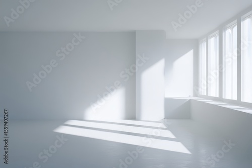 Bright White Interior, Sunlight Streaming Through Modern Window, Shadows on Floor