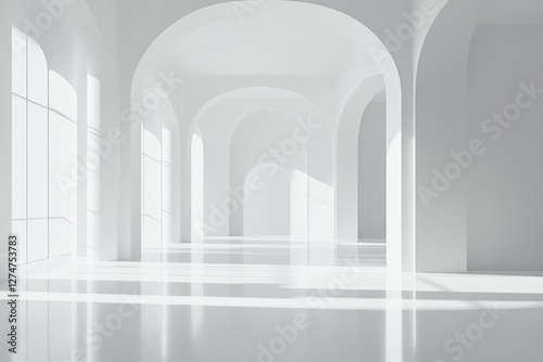 Bright white minimalist interior with arched doorways and large windows casting soft shadows on the reflective floor, creating a serene and elegant atmosphere