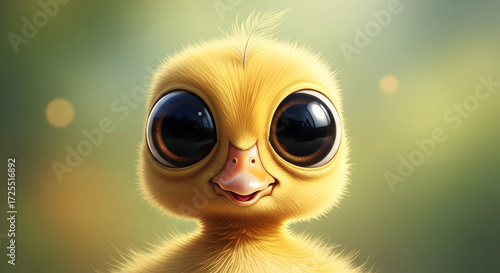 Bright Yellow Baby Duck with Big Eyes, Nature Background, Close-Up Shot of the Duckling's Beautiful Features and Expressions