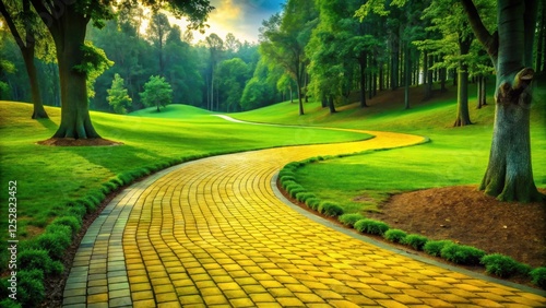 Bright yellow brick road winding through lush emerald green landscape, brick road, yellow, winding, lush, emerald green