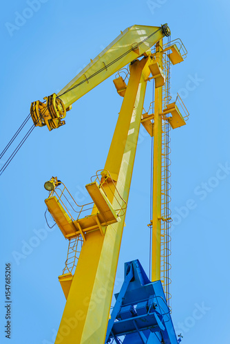 Bright yellow industrial crane structure rising against clear blue sky, showcasing engineering detail. Concept of crane technology, heavy machinery, urban port infrastructure