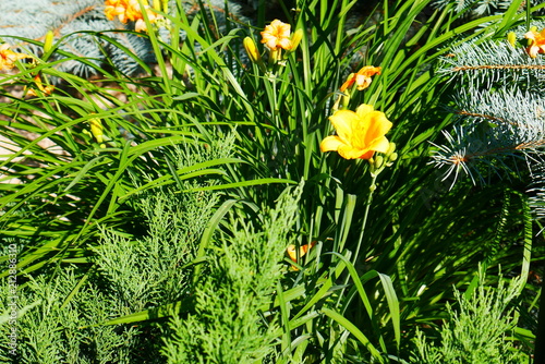 flowerbed, ornamental garden, daylily, flower, lily, arrangement, background, beauty, blossom, arboretum, bouquet, bright, bud, bunch, bush, cultivated, day, decoration, elegance, flower head, freshness, grass, horizontal, idylli, in bloom, landscaped, leaf, luxuriant, nature, no people, outdoors, photo, plant, springtime, summer, sunny, vibrant color, yellow