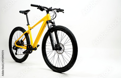 Bright yellow mountain bike stands isolated on clean white background. New bicycle features knobby black tires, sturdy handlebars, comfortable, disc brakes. Perfect for outdoor adventures, rough