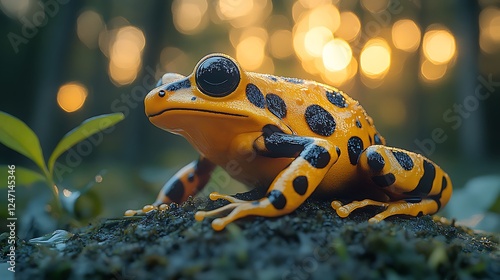 Bright Yellow Poison Dart Frog Resting on Forest Floor During Golden Hour