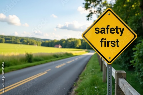 Bright yellow "Safety First" sign on a fence by a winding country lane, rural road, safety first sign