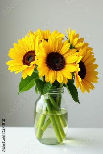 Bright yellow sunflower arrangement in a glass vase, bouquets, sunny, bright