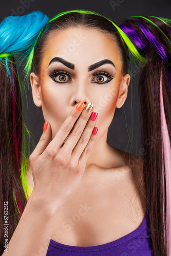 make-up, manicure, portrait, colours, fashion, holiday, beauty, hair, girl, woman, face, sale, stripes, rainbow, hand, nail polish, look, smile, surprise, background, people, tail, skincare