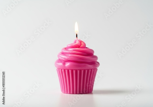 Brightly colored cupcake shaped novelty candle on a white background, symbolizing celebration, joy, sweetness, and happy dessert moments, flame, treat, closeup