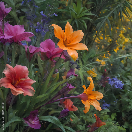 brightly colored flowers in a garden with a bird on the top