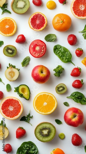 Brightly colored fruits and vegetables on white background, perfect for food packaging design, healthy eating blogs.