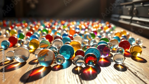 Brightly colored marbles scattered on wooden surface, creating a playful and vibrant scene of childhood memories.