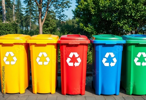Brightly colored recycling bins with clear recycle symbols outdoors, arrows, metal