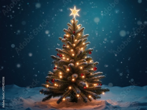 Brightly Lit Christmas Tree Adorned With Ornaments and a Star, Under a Gentle Snowfall