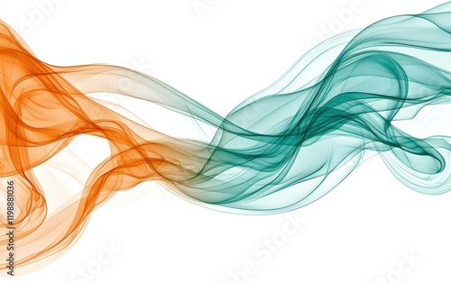 Brilliant cyan, orange, and green smoke clouds merging in fluid patterns, isolated on a white surface