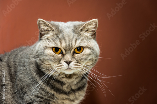 British cat is strict and serious looking to camera. Funny cat with orange eyes.