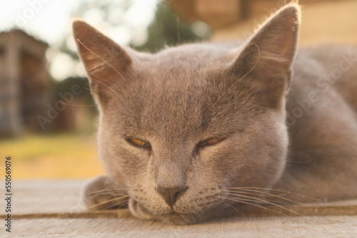 british shorthair cat with blue gray fur sleeping on wooden bench. sunset lights. Portrait of a gray cat relaxing in nature.