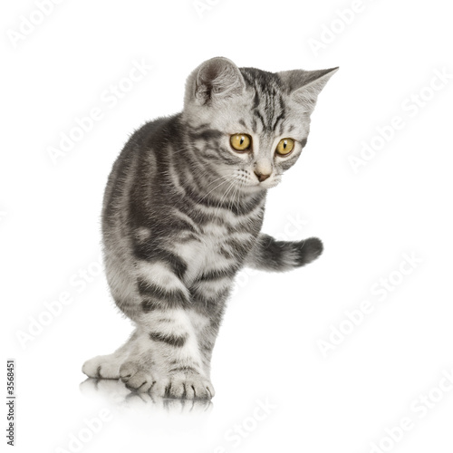 kitten, cat, adorable, animal, coat, cute, eye, domestic, fuzzy, gaze, grey, isolated, pet, pet, posing, breed, purebred, pedigree, stare, white, whisker, collar, studio shot, playing, standing up, staring, young, baby, mammal, white background, isolated on white, felino, cat, fur, furry