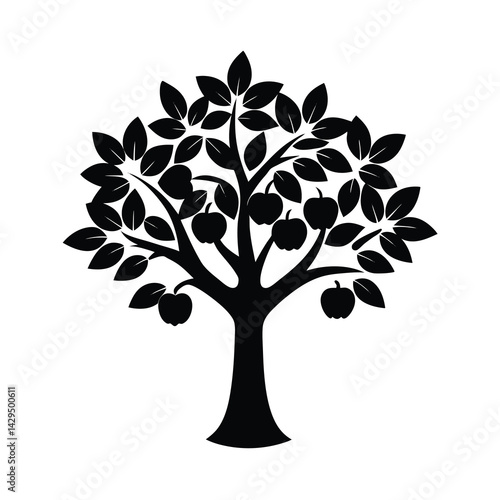 tree, apple, broad, canopy, fruit, leaf, plant, nature, green, vector, design, silhouette, icon, wood, tree branch, forest, flora, eco, harvest, autumn, garden, summer, root, illustration, classic, shade, natural, organic, growth, season, farm, fruit farm
