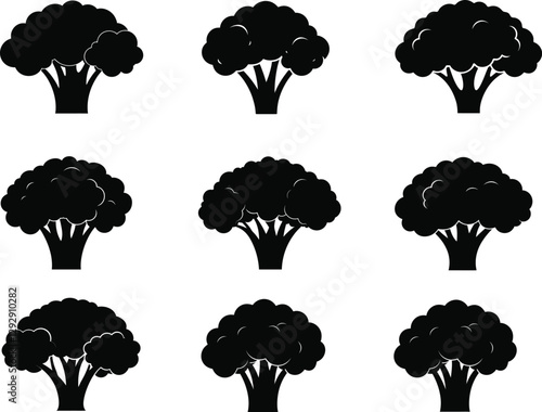 Broccoli Silhouette Icon Eps Set , Black Vegetable Vector Clipart, Broccoli Brassica Oleracea.