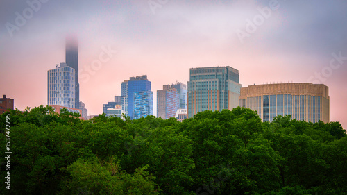 Brooklyn downtown skyline and buildings in New York City, viewed from the Brooklyn Bridge at a foggy summer sunset after rain over the East River in USA