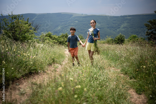 children, brother, sister, holding hands, walking, country, path, summer, sunny, day, countryside, nature, landscape, field, grass, flower, meadow, outdoors, happy, childhood, togetherness, family, love, adventure, exploration, carefree, lifestyle, rural, scenic, travel, vacation, holiday, fun, joy, healthy, active, green, blue, sky, hill, mountain, wildflower, daisy, bouquet
