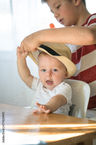 Brother wear hat baby brother boy. Family with children at home. Love, trust and tenderness