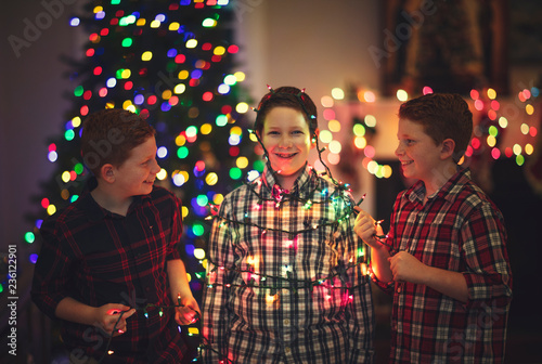 christmas, children, holiday, family, happy, new, children, year, light, tree, people, christmas, magic, background, red, children, winter, fun, celebration, night, light, beautiful, happiness, cheerful, young, person, face, decoration, concept, joy, expression, childhood, children, portrait, twin, tied up, silly, funny, laughing, authentic, candid, indoor, plaid, shirt, home, redhead, sibling, brother, boy