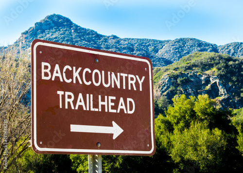 brown and white sign saying "Backcountry Trailhead" in the Santa Monica Mountains of California