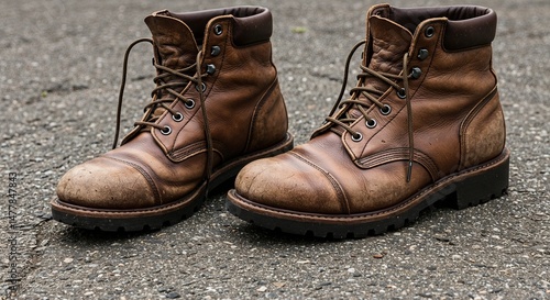 Brown boots left on asphalt pavement in urban setting