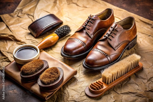 brush, polish, clothes, cream, paper background, footwear, leather goods, fashion accessories