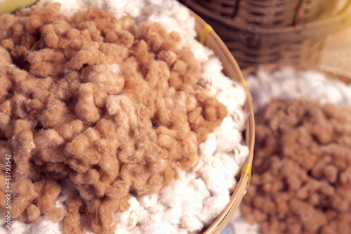 brown cottons in basket are ready to be spun to native yarns in Thailand.