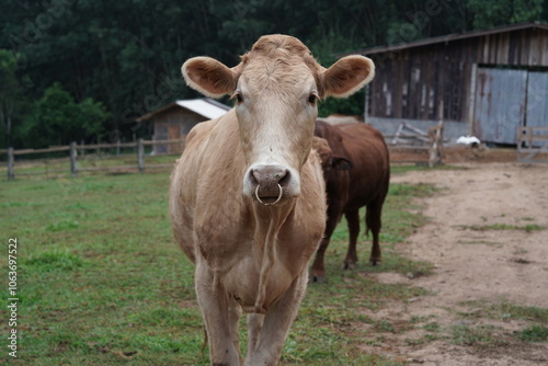 Brown cow standing and eating grass in a field
