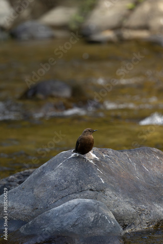 Brown dipper perched on a river rock above flowing water.