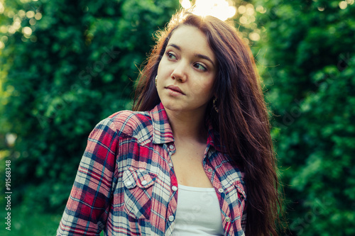 Brown hair girl sitting on the grass in the park and posing to the picture.
