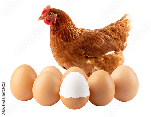 Brown hen with fresh eggs including one cracked open showing white interior on transparent background