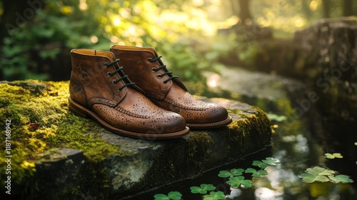 boot, leather, brown, brogue, shoe, mossy, rock, nature, outdoors, forest, stream, water, green, sunlight, morning, calm, peaceful, tranquil, serene, quiet, stillness, elegance, style, fashion, footwear, craftsmanship, quality, detail, texture, autumn, fall, timberland, river bank, plant, clover, leaf, rustic, environment, scenic, background, image, photo