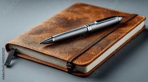 Brown Leather Notebook and Metal Pen, Office Desktop Still Life