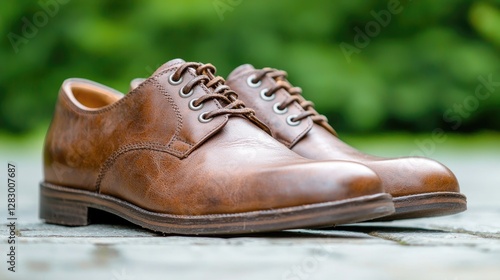 Brown leather shoes outdoors, garden background, product shot