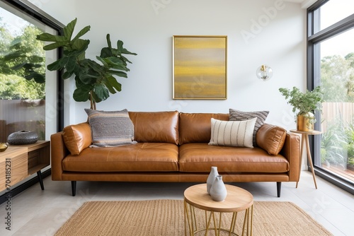 interior design, living room, sofa, coffee table, rug, plant, window, natural light, leather, brown, modern, contemporary, minimalistic, scandinavian, danish, retro, vintage, industrial, loft, apartment, house, home, real estate, property, architecture, decoration, living space