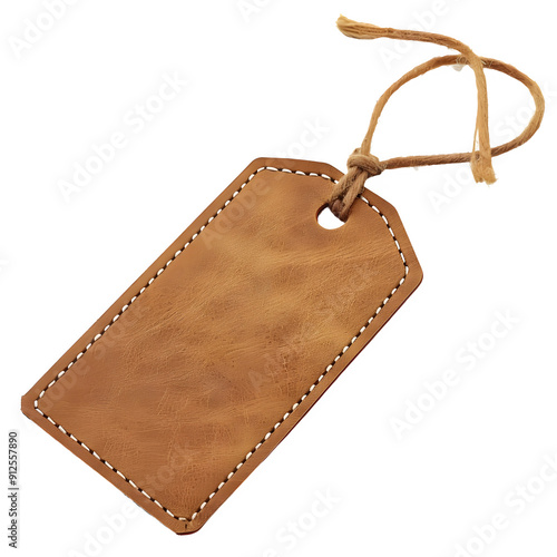 Brown leather tag with a string, set against a clear background, great for adding labels or branding