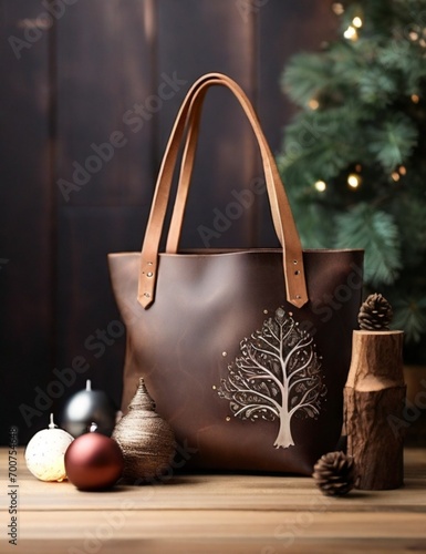 brown leather tote bag mockup with decorations. bokeh on wooden background