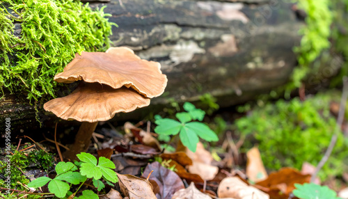 mushroom, fungal, nature, forest, moss, floor, wood, log, plant, foliage, ground, outdoors, flora, brown, tan, green, clover, leaf, environment, ecology, wild, closeup, growth, natural, season, autumn, fall, botany, wildlife, background, macro, detail, root