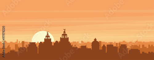 Brown panoramic poster of the city skyline with misty background buildings, sunrise, clouds and mountains of LIVERPOOL, UNITED KINGDOM