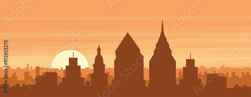 Brown panoramic poster of the city skyline with misty background buildings, sunrise, clouds and mountains of PHILADELPHIA, UNITED STATES
