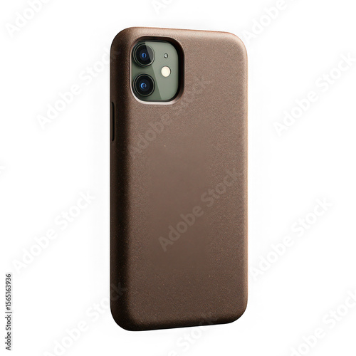 Brown phone case on a white background showing camera lenses and side button