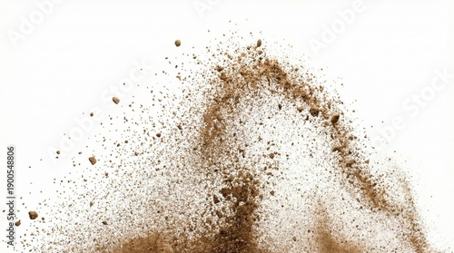brown, powder, explosion, white, background, dust, particle, flying, burst, scatter, debris, fragment, dynamic, motion, movement, energy, action, dramatic, effect, texture, granular, material, substance, chaos