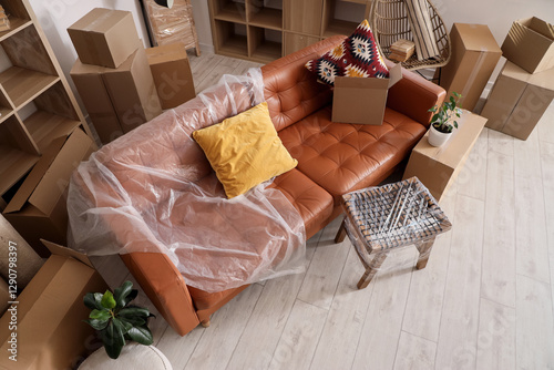 Brown sofa with film and cardboard boxes in living room on moving day, top view